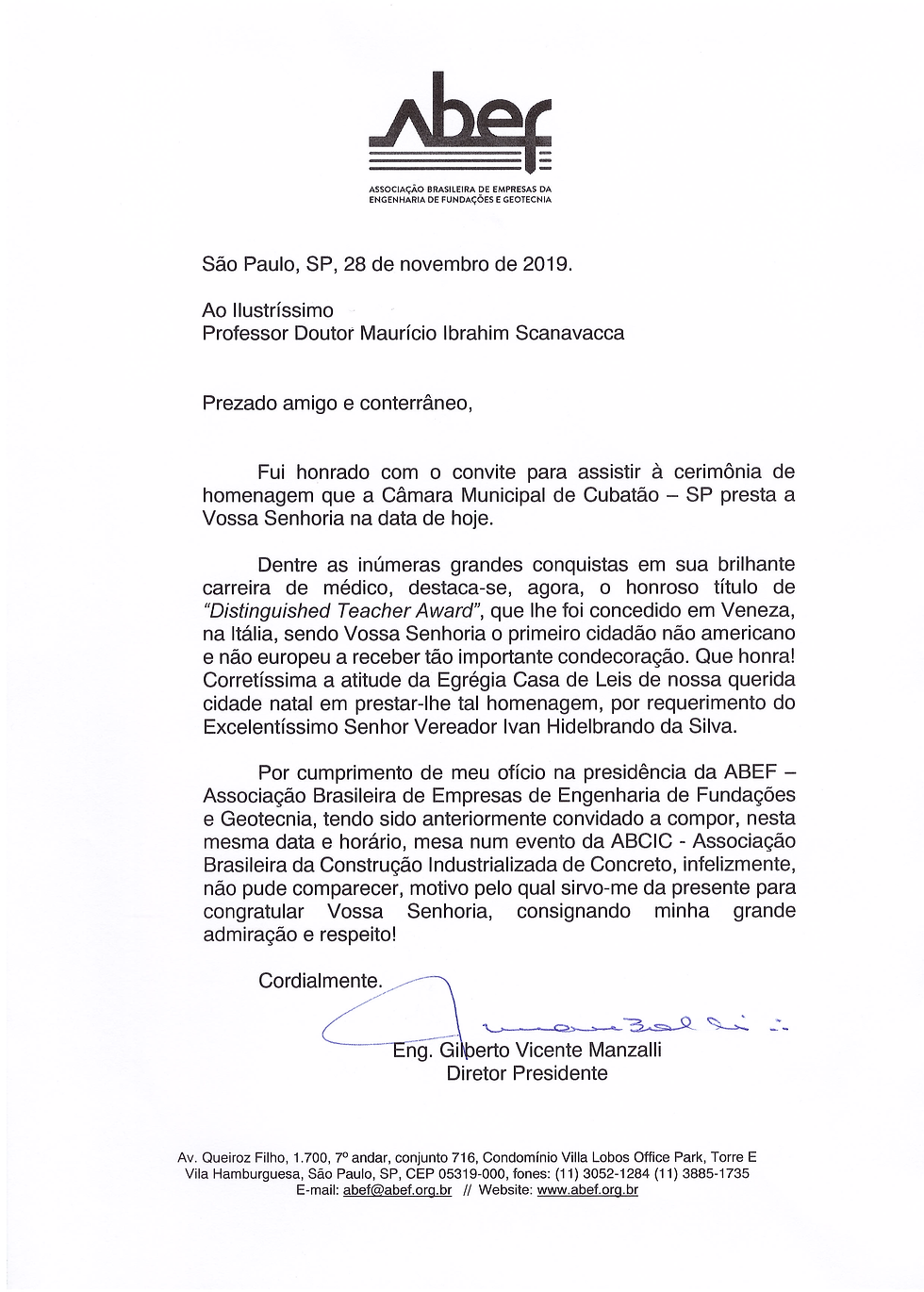 A ABEF congratulou esse brilhante médico brasileiro, conterrâneo e amigo do Diretor Presidente, Eng. Gilberto Manzalli.
